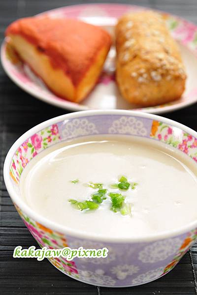 女主廚用日本鮮百合(百合根)代替南瓜,以法式忌廉湯的煮法做出清香美味的忌廉湯。