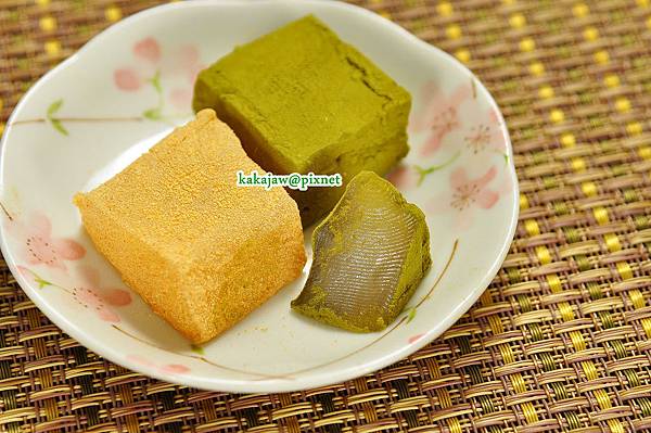 7 涼透後,反扣出來,以尖刀切15份,逐件放在黃豆粉或抹茶粉上沾滿。