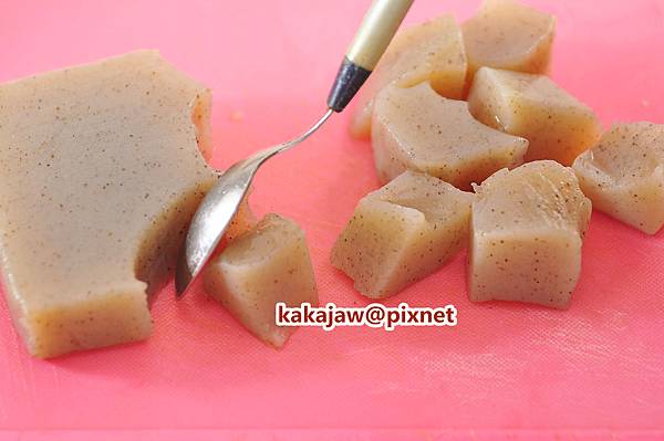 2 蒟蒻用匙刮小口,少鹽撈一撈,10分鐘後沖洗,放入沸水略煮,過篩。