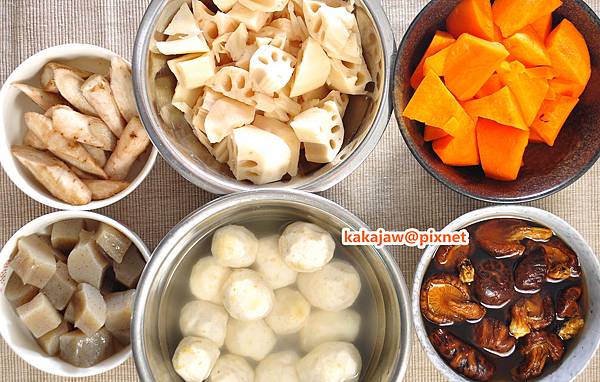 雞腿2片/蓮藕300g/日本牛蒡2枝(約14cm長)/小芋里8個/冬菇6隻/蒟蒻200g/