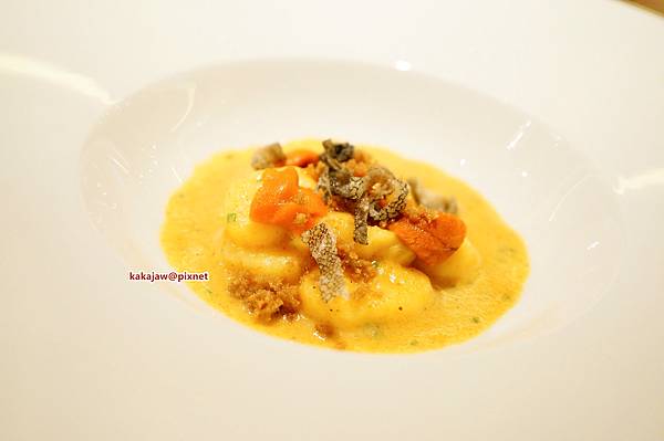 Homemade gnocchi with bottarga and sea urchin