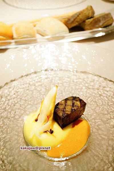 燒小牛舌與玉米蓉及辣味肉汁