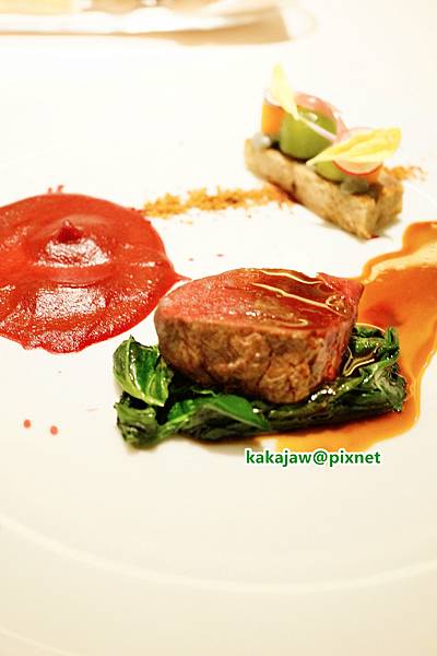 鹿肉配紅菜頭醬蓉、榛子及藍黴乳酪